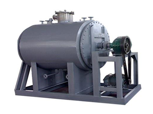 被干燥物料從殼體上方正中間加入,在不斷正反轉(zhuǎn)動的耙齒的攪拌下,物料軸向來回走動,與殼體內(nèi)壁接觸的表面不斷換新,受到蒸汽的間接加熱,耙齒的均勻攪拌,粉碎棒的粉碎,使物料表面水分有利的排出,氣化的水分經(jīng)干式除塵器、濕式除塵器、冷凝器,從真空泵出口處放空。